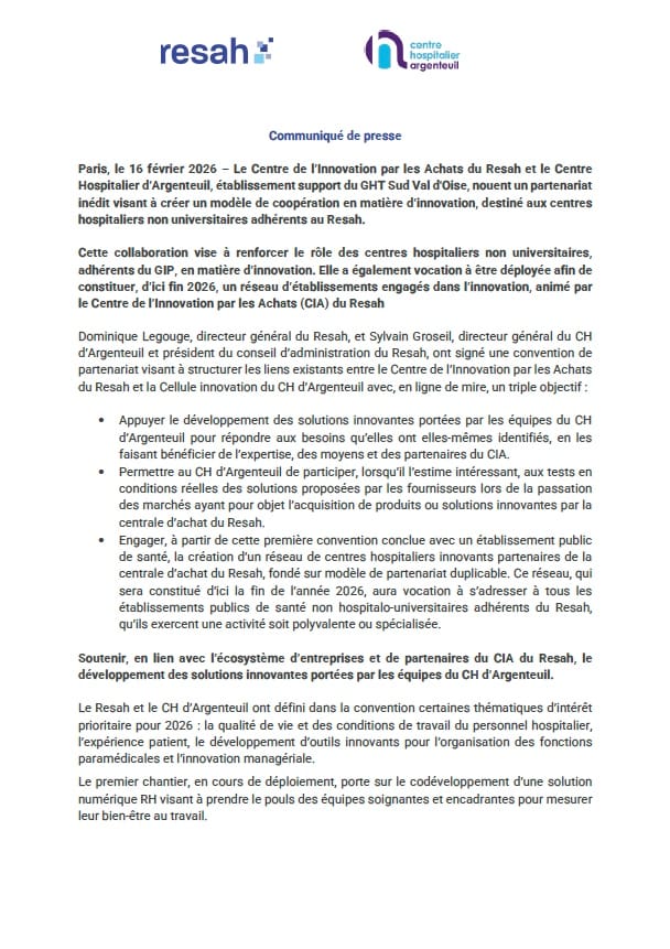 Le Centre de l’Innovation par les Achats du Resah et le Centre Hospitalier d’Argenteuil, établissement support du GHT Sud Val d'Oise, nouent un partenariat inédit visant à créer un modèle de coopération en matière d’innovation, destiné aux centres hospitaliers non universitaires adhérents au Resah.