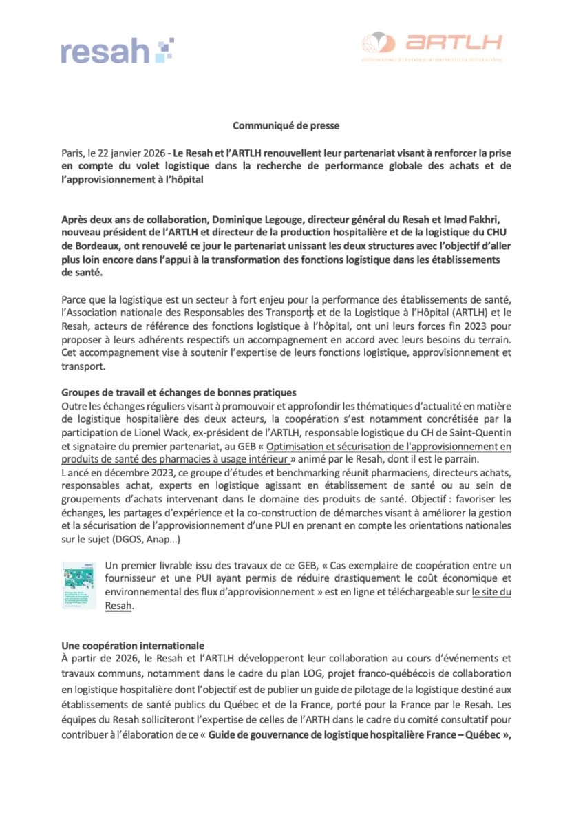 Le Resah et l’ARTLH renouvellent leur partenariat visant à renforcer la prise en compte du volet logistique dans la recherche de performance globale des achats et de l’approvisionnement à l’hôpital
